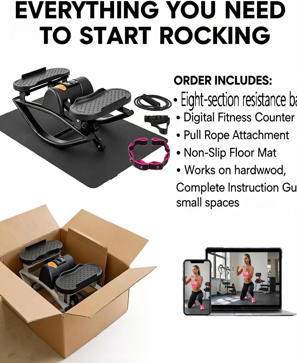 • Maximize Your Burn: 15-Min full body workout: short on time but want big results? just 15 minutes on this rocking stepper burns up to 200 calories—equivalent to a 30-minute run or 20-minute cycle. the included detachable resistance bands allow you to tone your arms, chest, and shoulders simultaneously, providing a complete full-body aerobic session from the comfort of your living room